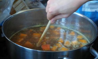 Artık bir tutam tuz, en sevdiğiniz baharatları ve kelimenin tam anlamıyla bir çorba kaşığı et suyu veya domates suyunu ekleyebilirsiniz. Isıyı en aza indirin, bir kapakla örtün ve içindekileri on dakika boyunca unutun.